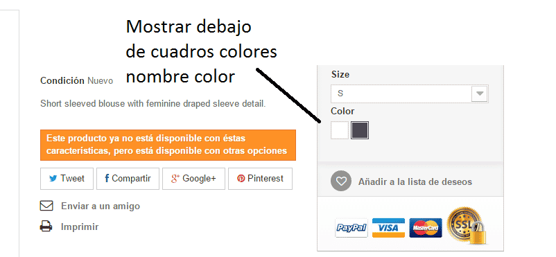 Se puede mostrar el nombre del color, debajo de los atributos de los colores generados por las combinaciones en la ficha del producto en Prestashop 1.6